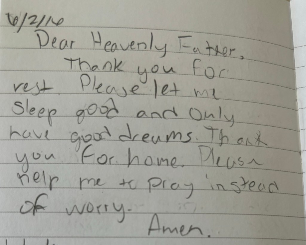 As evidence that prayers do get answered nearly ten years later. I found an old prayer journal from 2016. The date was marked as 6/2/16, in case you can’t read my messy handwriting as a middle schooler. And the note reads, “Dear Heavenly Father, Thank you for rest. Please let me sleep good and only have good dreams. Thank you for home. Please help me to pray instead of worry. Amen.”