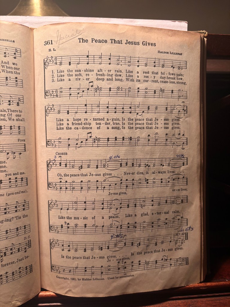 All the old memories, all the new to come. There is so much of His goodness just looking at me from every aspect of my life. I see Him in my past, I see where He is now and I know He is going to be there in the future. In the midst of the mixture of emotions, it feels nearly impossible to have a sense of peace at all. The last bit of my time at the piano I spent just simply bawling and rolling through the pages of my grandmothers old hymnal, but found myself completed stopped with tears rolling down my face at the only song she seemed to have labeled as Special, which meant it was the special music for the day at church when she would play the organ. Which the song was, The Peace That Jesus Gives. I encourage you to read the lyrics. The Lord had her label that page just for me to find today, just so that I’d know He was still here with me, even in the midst of both sadness & joy.